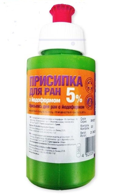 Присипка для ран із йодоформом 5% — призначена для оброблення шкірних уражень у з/х і домашніх тварин.